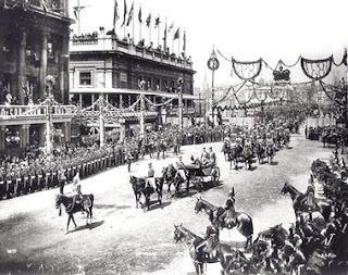 In case anyone missed it, we lucky few, we band of brothers - i.e. Great Britain and the Commonwealth - have been celebrating the Queen's Diamond Jubilee. On balance it's looked a lot jollier than Queen Victoria's Diamond Jubilee. Judging from the pictures, de rigeur behaviour for that was to stand very quietly in the streets in case a sudden noise brought the celebrations to a quick end.